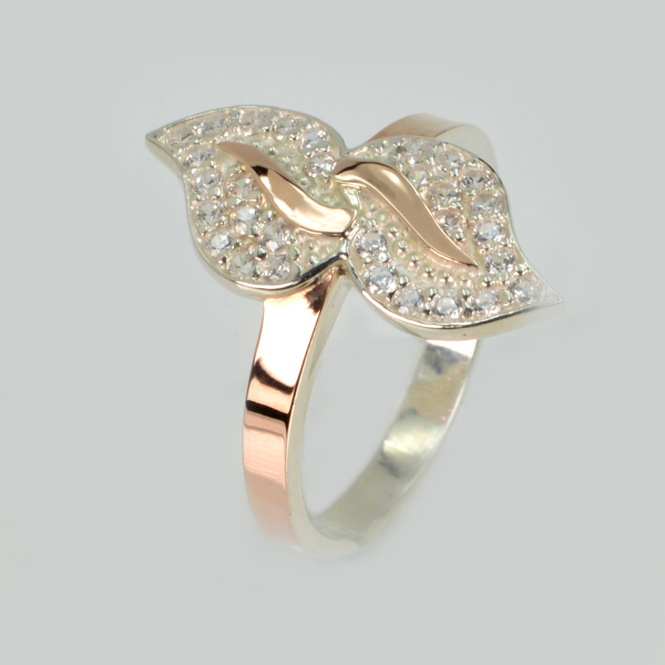 Срібна каблучка з золотими пластинками і фіанітами